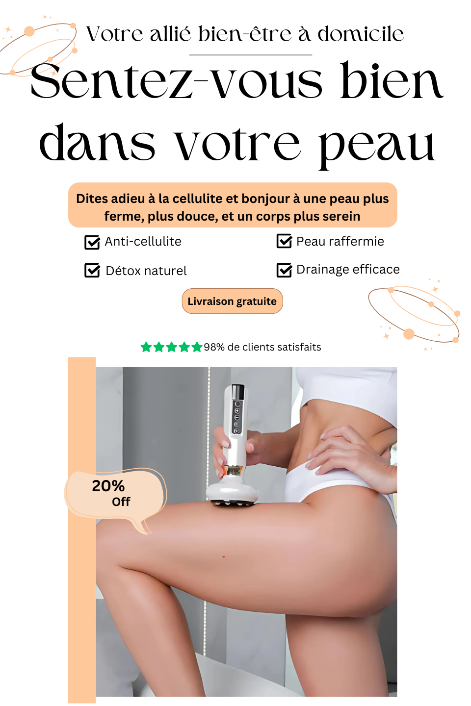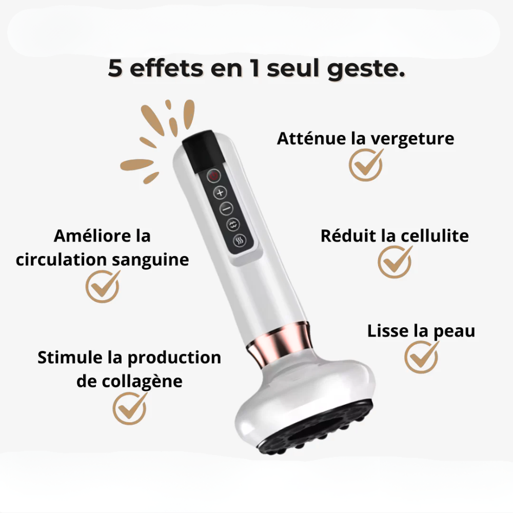 Conçu pour cibler la cellulite et les tensions musculaires, il combine l’efficacité du massage par ventouses, la chaleur infrarouge apaisante, et 12 niveaux d’aspiration pour un résultat adapté à votre corps.